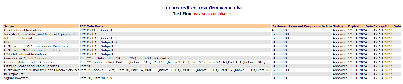2023年12月,BACL东莞实验室成功获得美国FCC授权测试实验室,测试范围可覆盖2G/3G/4G/5G无线通信,微波和毫米波、Reapter、SAR、超宽带等无线射频全品类,频率范围可以达到325G,成为全球范围内极少数可达到此频率范围的FCC实验室!